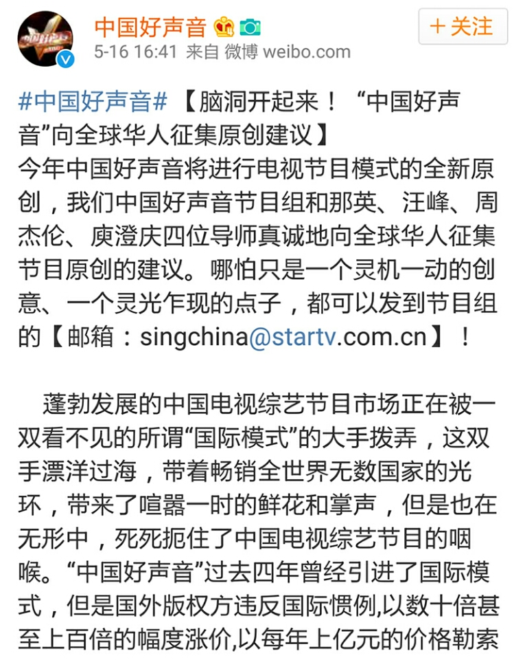 《中国好声音》节目组发此倡议书,屡次强调目前中国电视市场几乎被海外模式占领,这不仅令人痛心,而且中国文化被逐渐侵蚀和同化更是可悲可叹。这是一封义正言辞的倡议公告,意欲掀起全民创新意识,为2016全新改版《好声音》宣传造势,但却只是略起波澜,并不被网友买账。已经充分把握市场的现象级好声音,到底是真创新还是真无奈?