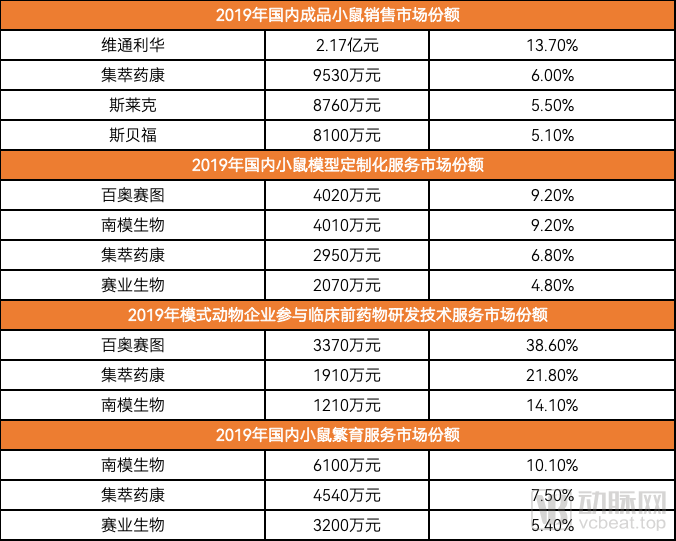 根据2019年的统计数据,在成品小鼠、定制小鼠、CRO服务和小鼠繁育服务等四大主要的模式动物市场中,几家头部企业均占据了合计超过20%的市场份额。其中,在相对较新的CRO服务市场,百奥赛图、集萃药康和南模生物等头部企业的优势最为明显,合计占据近8成市场。