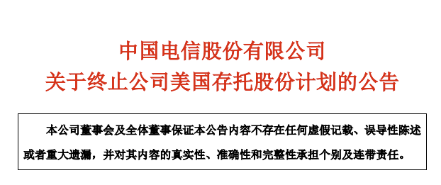 9月10日,中国电信发布公告称,公司于2021年9月9日召开第七届董事会第九次会议,审议通过了《关于终止公司美国存托股份计划的议案》。鉴于公司美国存托股份已于2021年5月18日退市,公司董事会于2021年9月9日决议终止美国存托股份计划。同日,公司与公司的美国存托股份代理机构纽约梅隆银行就终止该计划签订协议函。