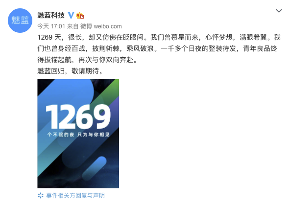 9月10日,@魅蓝科技 微博宣布,时隔1269天,魅蓝回归。