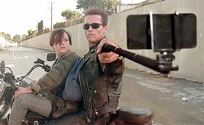 乡村小道,摩托车,飞扬的尘土加上手里的自拍杆,如果不是《终结者》里施瓦辛格这张无懈可击的帅脸,还真是和乡镇青年有点傻傻分不清楚。