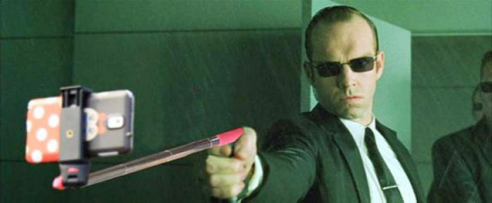 《黑客帝国》里经典的黑超和自拍杆,两者都是自拍达人们居家旅行必不可少的神器。