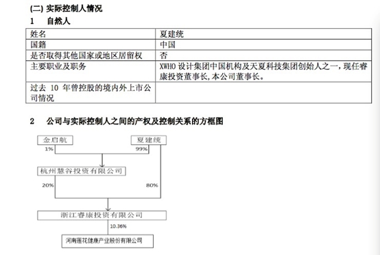 根据莲花健康2015年年报,夏建统为公司董事长,为公司实际控制人。莲花健康第一大股东为“浙江睿康投资有限公司”,持股占比达10.36%。夏建统同为浙江睿康投资有限公司法定代表人。