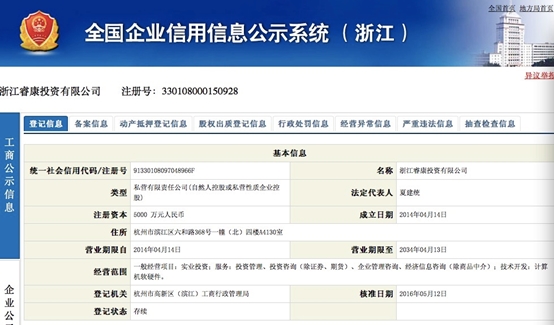 此外,对于浙江睿康投资有限公司,界面新闻并未通过公开渠道查询到其官网,通过全国企业信用信息公示系统,浙江睿康投资有限公司信息如下图。