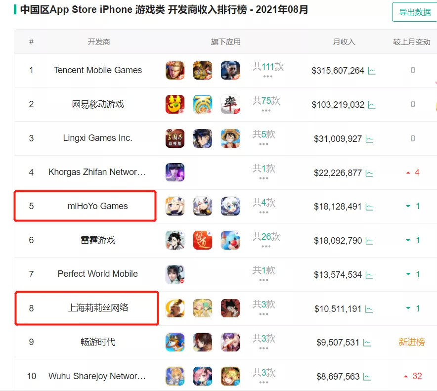 专注自研IP的公司也已经对头部厂商构成了一定挑战,七麦数据8月iPhone游戏开发商收入排行榜上,米哈游和莉莉丝分列第5和第8。