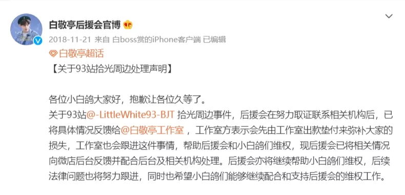 最为典型的是粉丝后援会不发货周边、“卷款跑路”的违法行为,今年Jennie和朴灿烈的国内粉丝团都被认为有类似的行为,涉案金额高达上千万。国内粉圈中,三年前白敬亭的应援站没有及时发货,月底白敬亭工作室发布声明,称粉丝的损失将由工作室方面先行垫付,后续会对维权追讨行为持续跟进。