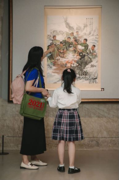 例如丁筱芳、丁阳父子联合创作的《红色圣地》礼赞建党精神,艾中信的油画《长征》礼赞长征精神,古元的版画《延安新貌》礼赞延安精神,陈逸飞、蔡江白的油画《只要主义真》礼赞烈士精神,范迪安为此次展览题词的书法《奋斗》传递奋斗精神,汪家芳为此次展览特别创作的《长城》弘扬长城精神……置身其中,聆听回响在岁月深处的奋斗足音,观众对奋斗的意义会有更深刻的理解和体会。