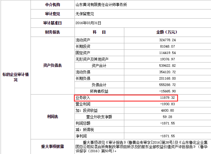 由山东黄河有限责任会计师事务所出具的标的企业审计情况显示,截至2016年3月31日,鲁北集团业务收入1.19亿元,净利润为亏损1871.55万元;流动资产、长期投资、固定资产、无形资产等分别为32.47亿元、8.1亿元、11.44亿元和1.94亿元,资产合计为53.96亿元。流动负债35.41亿元、长期负债20.12亿元,负债合计55.53亿元。所有者权益为-1.56亿元。