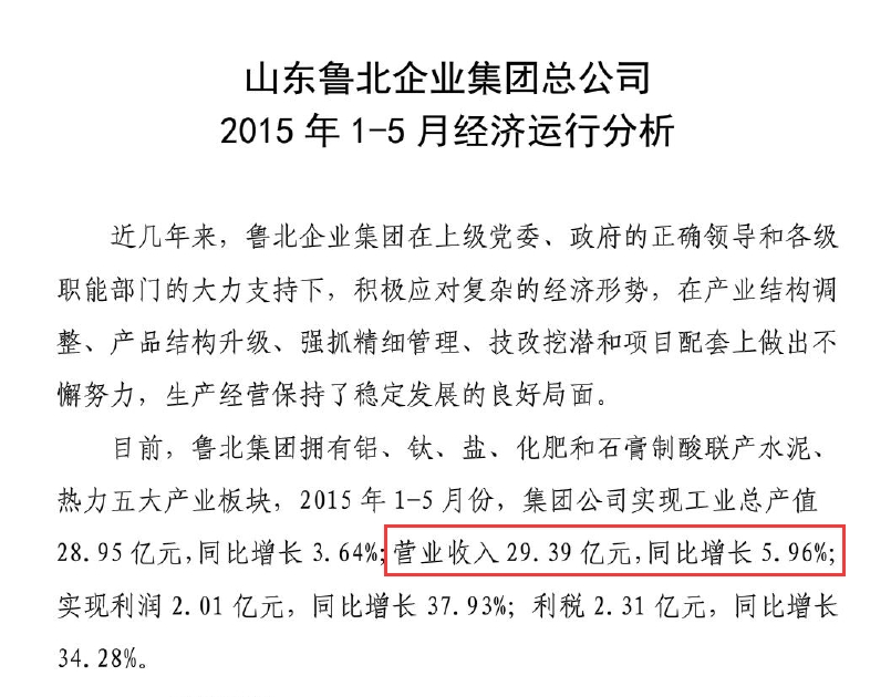 界面新闻记者获得的一份《山东鲁北企业集团总公司2015年1-5月份经济运行分析》的内部文件显示,仅2015年1-5月份,鲁北集团就实现营业收入29.39亿元,同比增长37.93%,利税2.31亿元,同比增长34.28%。
