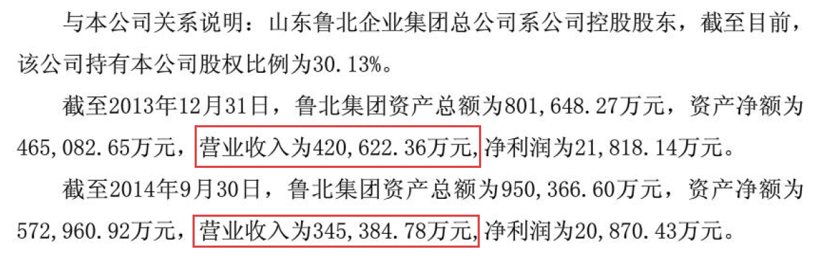 鲁北化工此前在一份《购买办公楼层暨关联交易公告》中也曾披露过鲁北集团的财务数据,这份公告显示,截至2014年9月30日,鲁北集团营业收入为34.54亿元,净利润为2.08亿元。按照前三季度的均值计算,鲁北集团2014年每季度平均营收为11.85亿元。
