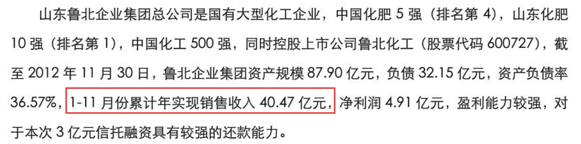 如果再向上追溯一年的话,2012年1-11月,鲁北集团实现销售收入40.47亿元,净利润4.9亿元。这份数据来自“华融信托鲁北企业集团信托贷款集合资金信托计划(第二期)推介书”。按照均值计算,鲁北集团平均月度营收为3.68亿元,一个季度的平均营收约为11.04亿元。