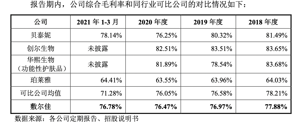 同样值得关注的是在招股书中披露的该赛道高企的毛利率,相比之下,敷尔佳收购北星药业后自产产品增加成本压力,同时又以经销模式为主,是否能够维持毛利率仍待观察。