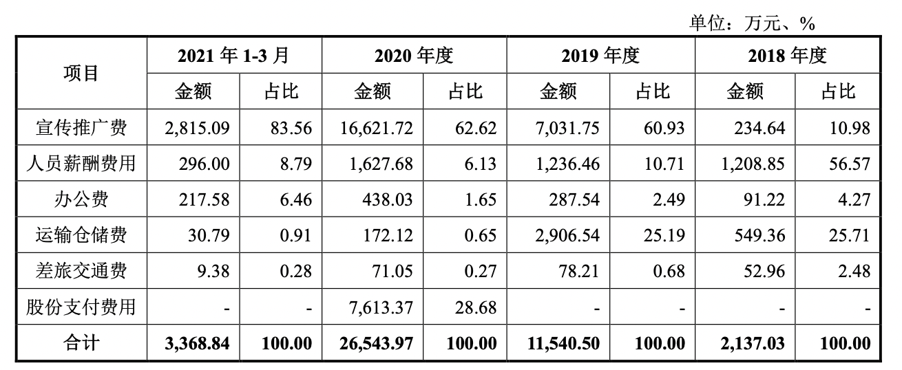 此外,2019年至2021年1-3月,公司形象宣传推广费用分别为1862.41万元、6907.83万元及318.45万元,主要系公司品牌形象代言支出及综艺、影视剧冠名等广告支出。