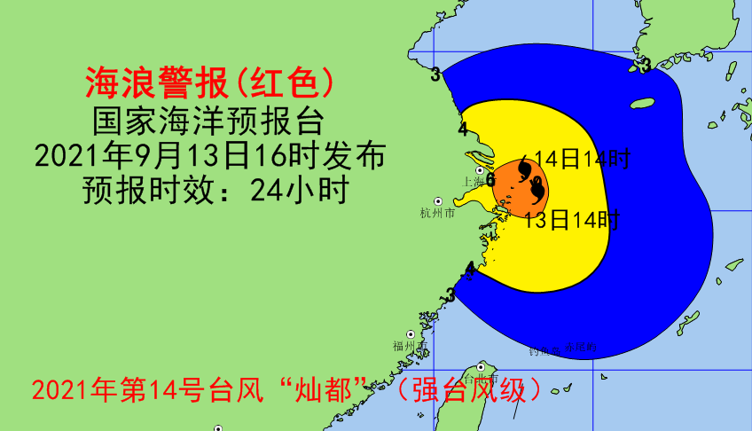 据国家海洋预报台消息,国家海洋预报台发布海浪红色警报:受今年第14号台风“灿都”(强台风级)的影响,预计:9月13日夜间到14日白天,东海将出现6到9米的狂浪到狂涛区,该近海海域海浪预警级别为橙色;上海、浙江北部近岸海域将出现4到6米的巨浪到狂浪,该近岸海域海浪预警级别为红色;江苏南部近岸海域将出现3到4米的大浪到巨浪,该近岸海域海浪预警级别为黄色;浙江南部近岸海域将出现2到3米的中浪到大浪,该近岸海域海浪预警级别为蓝色。