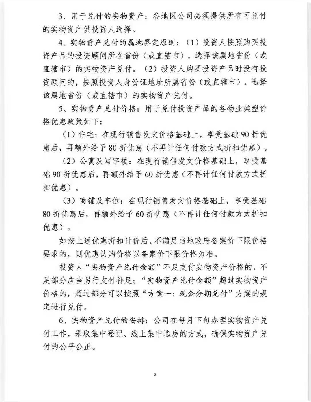 而用于兑付投资产品的各物业类型价格将有一定优惠政策。具体为:若选择住宅类型,在现行销售发文价基础上,享受基础9折优惠后,再额外给予8折优惠(不计任何付款方式折扣优惠)。