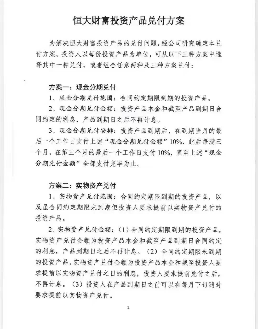 据界面新闻了解,为了解决恒大财富投资产品逾期兑付的问题,9月13日,恒大向投资者提供了三种兑付方案,分别为:现金兑付、实物资产兑现、抵扣购房尾款兑付。