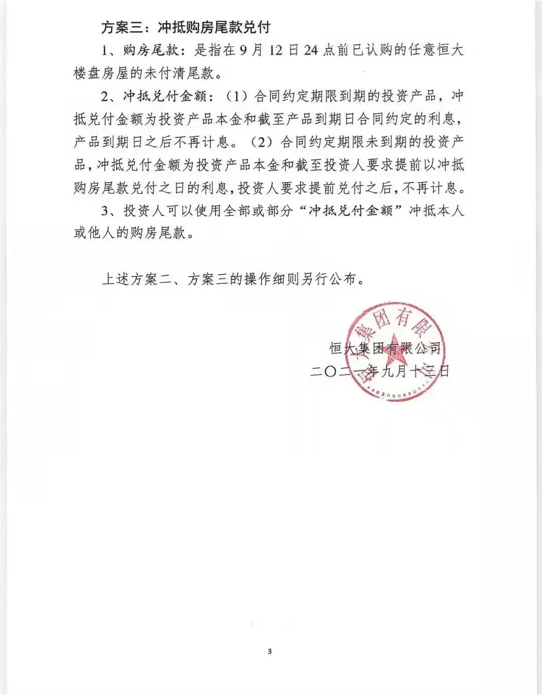 第三种方案为冲抵购房尾款兑付。方案显示,购房尾款是指在9月12日24时前已认购的任意恒大楼盘房屋的未付清尾款。