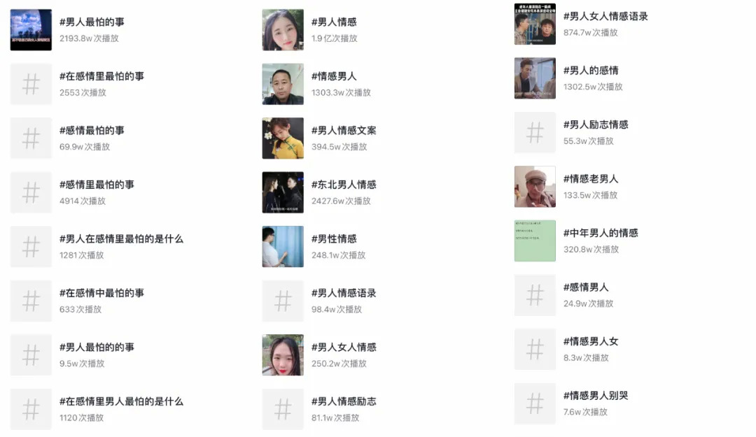 无数的情感博主蜂拥而至,#男人在感情里最怕的事##男人成熟与不成熟的爱情观##为什么男人在感情里如此卑微#等话题内容创造着不俗的流量。