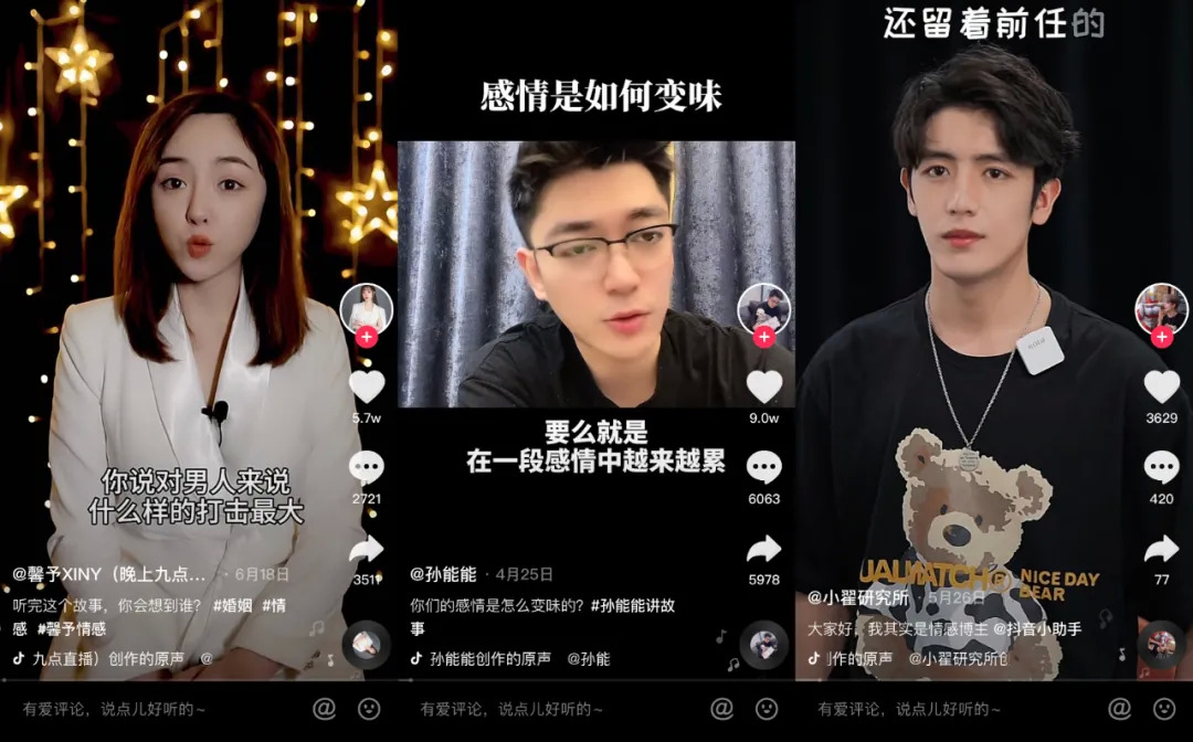 男人们来咨询情感问题,不仅让你我感到意外,就连MCN机构创始人张子默也没有想到,点开其公司旗下运营的三个情感抖音账号,不管主播是男是女,但无论是叙述口吻还是内容文本,几乎都是面向女性群体的,标题诸如“遇到这种男人一定要远离”“一段话让男生回心转意”“这样的男人心里根本就没有你”。
