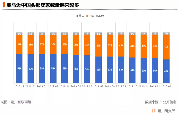 由于亚马逊的推荐机制让优质品牌获得更多的曝光机会,亚马逊的优质卖家价值自然更大。亚马逊上排名前10000的卖家被视作头部。中国商家在头部卖家中的占比在2020年初达到49%,比美国还多了2%。