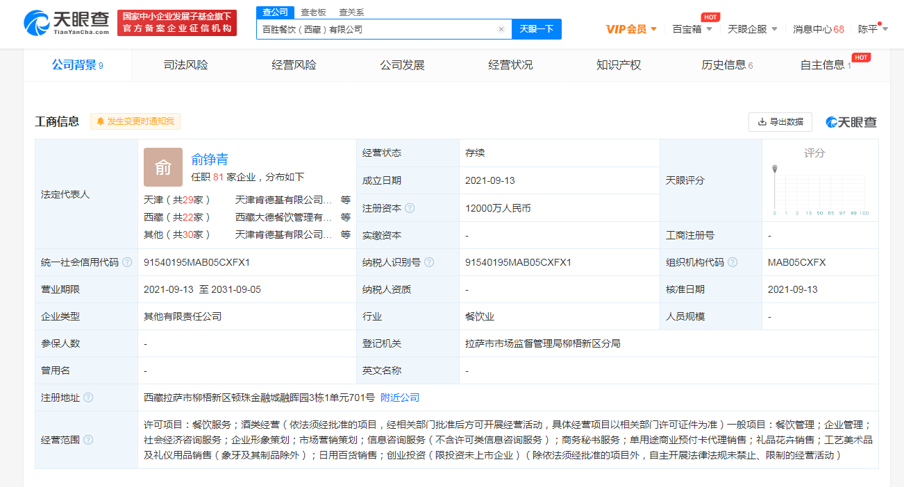 据天眼查APP显示,9月13日,百胜餐饮(西藏)有限公司成立,法定代表人为俞铮青,注册资本1.2亿人民币,经营范围包括餐饮服务;酒类经营;单用途商业预付卡代理销售等。股东信息显示,该公司由百胜国际管理咨询(三亚)有限公司、西藏大德餐饮管理有限公司共同持股,持股比例为60%、40%。