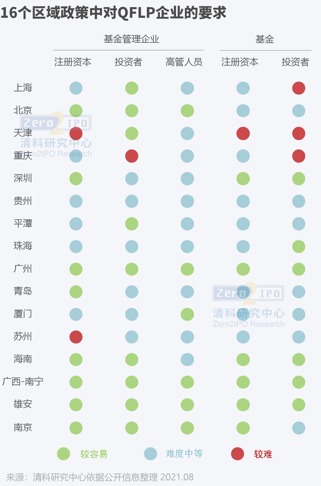 对于境外投资者,近年来门槛有所降低,早年出台的政策(例如上海、天津、重庆)均要求境外机构投资者的自有资产规模不低于5亿美元或管理资产规模不低于10亿美元,而近几年的新政对自有资产规模的要求下降到500万美元,管理资产规模下降到1000万美元。其他要求与境内投资者相似,需要拥有完善的风控、内控制度,相关的投资经验,机构投资者应该为主要投资者。