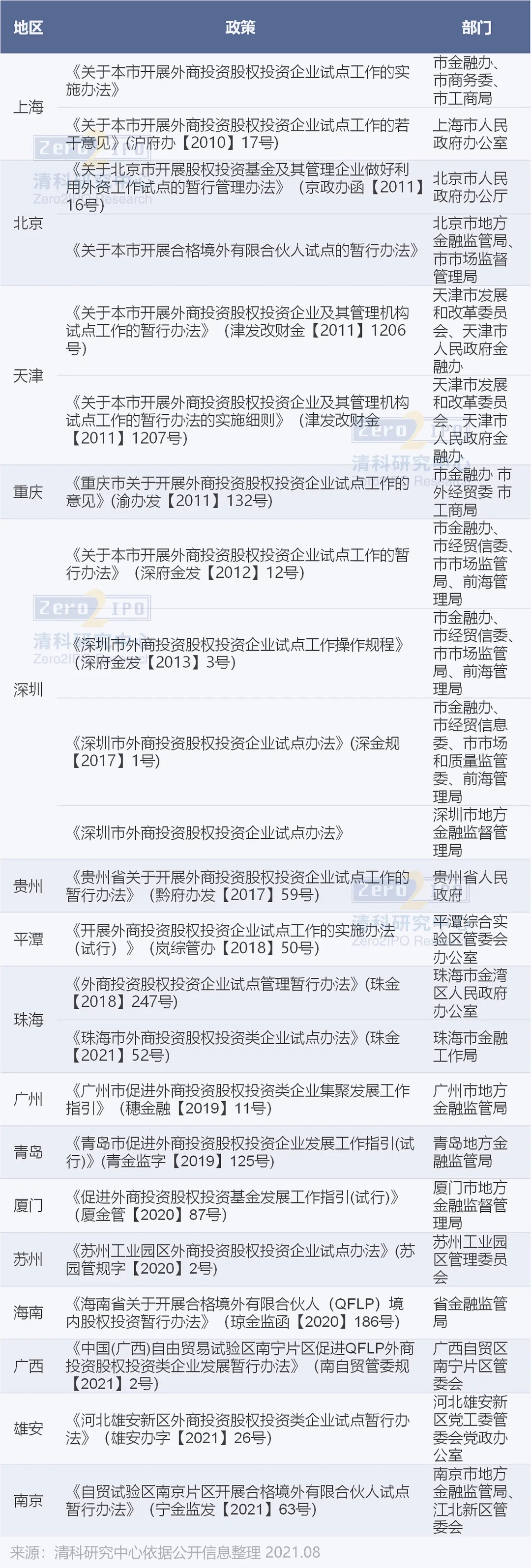 为支持高水平、全方位的对外开放,近年来各地纷纷出台地方性QFLP试点政策,给予外资投资境内股权更清晰、可操作的指引。截至2021年7月底,全国共有16个地区出台了QFLP政策,2021年发布频率有所加快,共有5个地区颁布/修订QFLP政策。在此背景下,清科研究中心发布《2021年中国QFLP试点政策研究报告》,梳理对比各地QFLP企业的监管架构、设立条件和运营模式。下文将选取报告中部分内容作简单介绍。