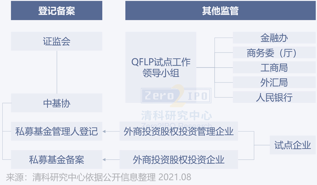 QFLP试点工作一般由各地区成立的试点工作联系会议或领导小组负责统筹协调,联席会议办公室或领导小组办公室一般设在地区金融办,部分也设在发改委、管委会等机构。除地方金融办、发改委外,QFLP试点还受到地方工商局、地方商务委(厅)、地方外汇局、地方人民银行的监管。