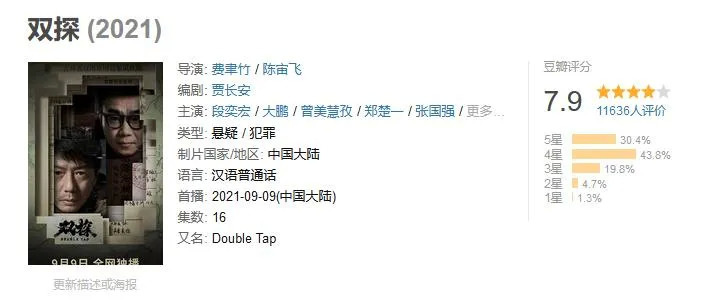 而剧集主演段奕宏和大鹏等的纯熟演技,无疑为《双探》的品质提供了更大保障。这些鲜活生动的角色,也让观众们拥有了更深的代入感。特别是常年混迹于大银幕的段奕宏,此次让观众们有了一个在小荧幕上欣赏他精湛表演的机会,本就是一个意外惊喜。
