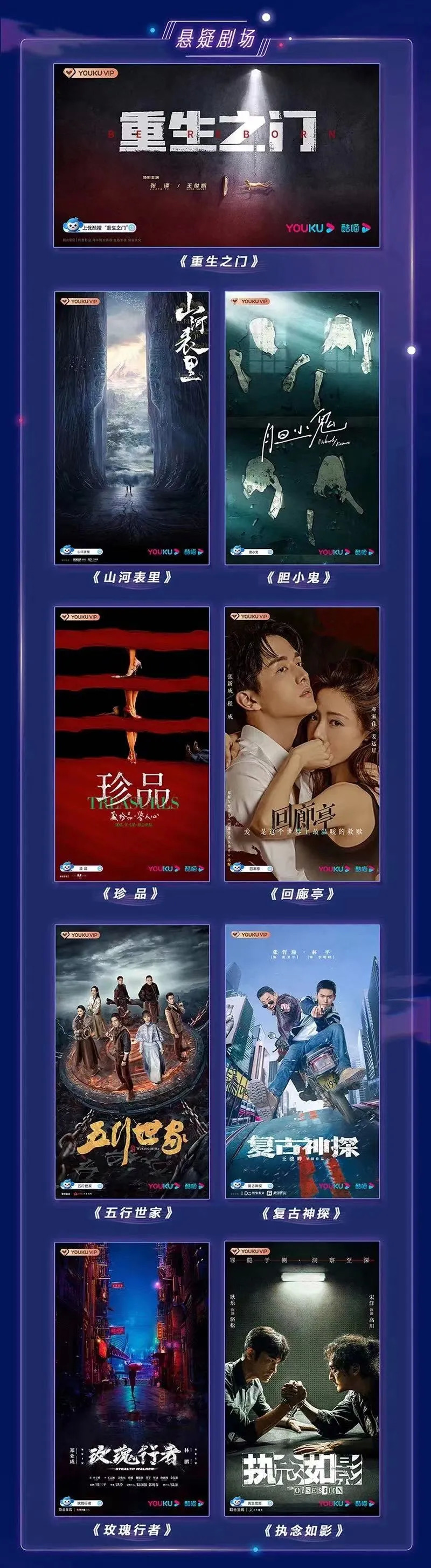首先是强化了剧场厂牌。除腾讯视频至今没有建立相关厂牌以外,爱奇艺、优酷、芒果TV均已开设悬疑剧场。剧场化运营一来能够通过类型化项目集合来打响厂牌,为项目与平台带来更强的传播属性,二来也能在提高用户认知度的同时,借此提升用户黏性,反哺平台流量。