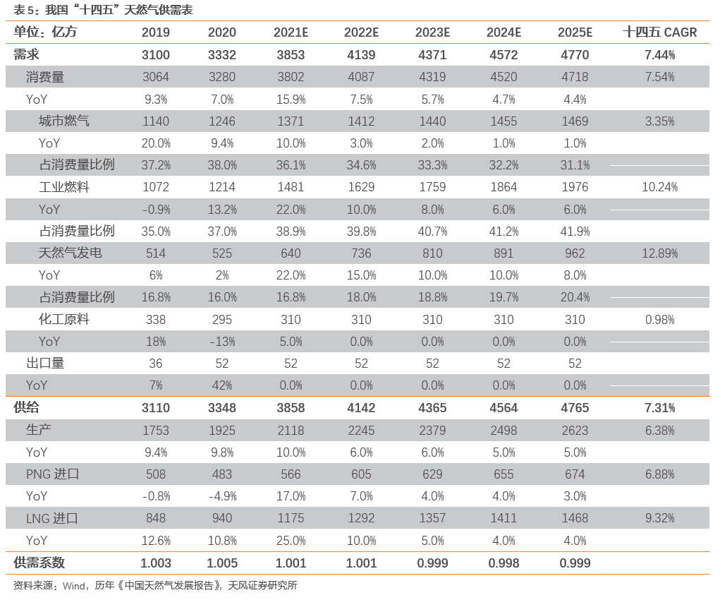 需求:十四五期间消费量CAGR达8%,2025年天然气消费量可超4700亿方,其中:
