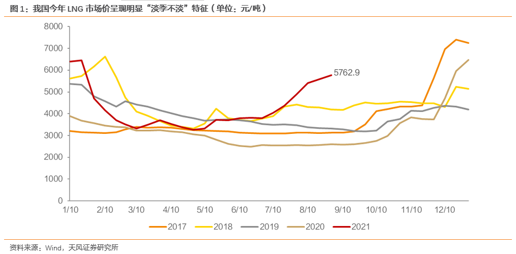 下半年:鲜明“淡季不淡”特征。下半年以来,虽仍处天然气传统淡季,但LNG价格呈现出鲜明“淡季不淡”的特征,进入7月之后LNG价格快速抬升,7月当月涨幅达30%,8月涨幅18%,两个月累计涨幅52%。截至8月31日,我国LNG市场价达5763元/吨,同比增加122%,相较2019年增加74%。下半年以来,即7~8月平均价同比增加96%,相较2019年增加47%。