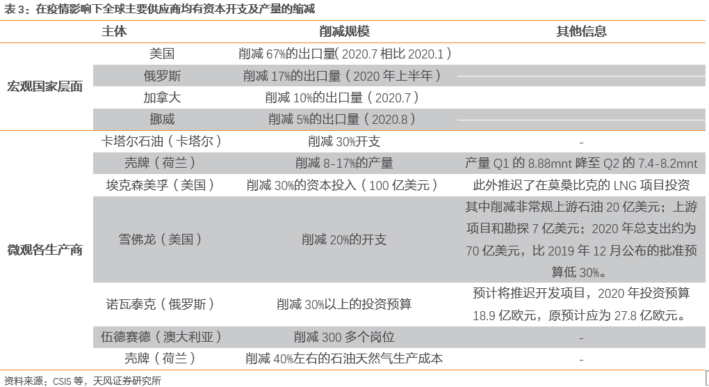 供给:资本开支缩减,产量跟进仍需时日。受疫情影响,2020年全球LNG量价两端表现疲软,大型天然气供应商资本开支意愿明显下降。根据国际能源网新闻,2020年美国38家石油和天然气公司将资本支出向下修订了36%,减少规模达410亿美元。支出削减的很大一部分是减少钻井和完井活动,这使得今年在旺盛需求下供给能力难以跟进。