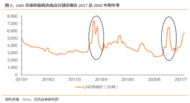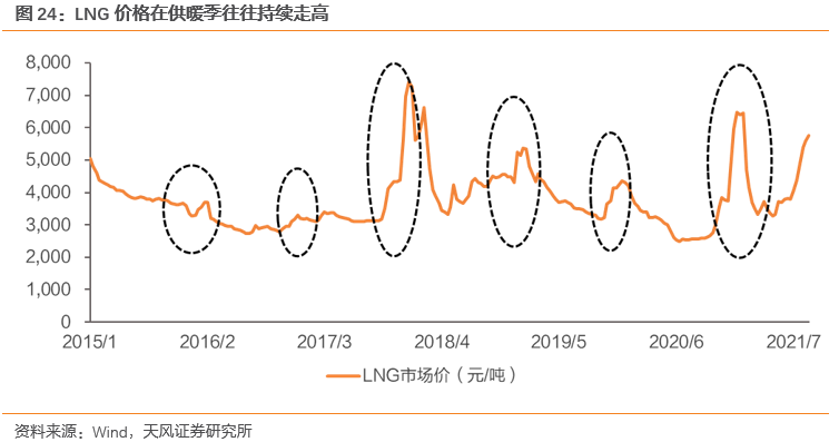 海内外的共振,是此次涨价的重要特征。我们对LNG近五年历史价格进行回溯,前期的两个高点分别在2017年冬季和2020年冬季出现。这一轮的涨价,相较前两次高点而言,第一个特殊点在于淡季涨价,即涨价的启动时点7月为传统的天然气淡季;第二个特殊点在于海内外普涨。