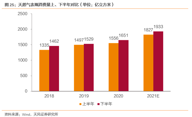 供给端:天然气供给主要包含国内产量、LNG进口量、PNG进口量三部分,假定它们2021年下半年增速与上半年相同,其下半年则分别为1043、629、279亿方。全年实现产量2088亿方,同比增加10.6%;LNG进口量1186亿方,同比增加26.2%;PNG进口量560亿方,同比增加15.8%。