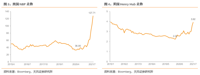 前两轮涨价主要集中在亚太地区,国内LNG价格以及亚太现货指数JKM大幅走高,欧美市场并无太大波动。而此轮涨价为明显的全球共振,无论是代表美国产地价格的HH还是代表欧洲天然气的英国NBP,均创下相当长时间内的新高。