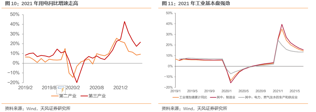 经济处复苏通道,高温进一步催化需求。一季度我国工业增加值同比增速明显高于历史同期,二季度单月增速也均保持在8%以上。上半年,我国用电量达3.93万亿千瓦时,同比增长17.3%,较2019年同期增长15.8%,两年同期平均增长7.6%。