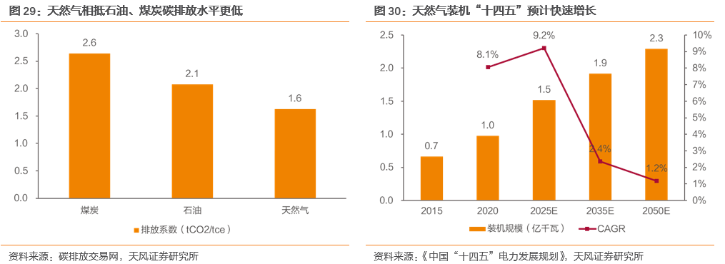 工业燃料方面,在两碳目标下,天然气对燃煤锅炉的替代,即“工业煤改气”或将提速,且天然气综合能源项目“减排+可再生能源协同”作用突出,预计将为天然气在工业燃料中的应用提供增量。发电用气方面,在光伏、风电不稳定性仍存,煤电装机缩减的背景下,气电的成长性在碳达峰过程中或将凸显,预计2025、2035年气电装机将达到1.5、1.9亿千瓦,十四五期间复合增速将达9%。因此,综合四大需求分析,城市燃气需求增长稳健,工业燃料、发电用气或将提供突出增量。