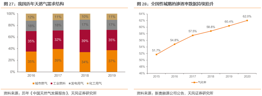 城市燃气主要包括居民及商业用气,在每年1个百分点左右的渗透率的提升以及城乡煤改气的持续推进下,将维持稳定增长。化工用气一方面占比较小、贡献增量有限,另一方面受相关化工行业周期性影响,成长性并不显著。