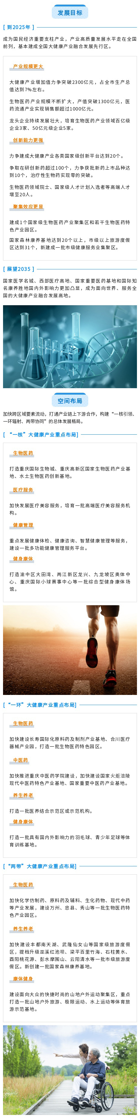 根据《规划》,重庆到2025年基本建成全国大健康产业融合发展先行区。到2035年成为面向世界、服务全国的大健康产业融合发展高地。