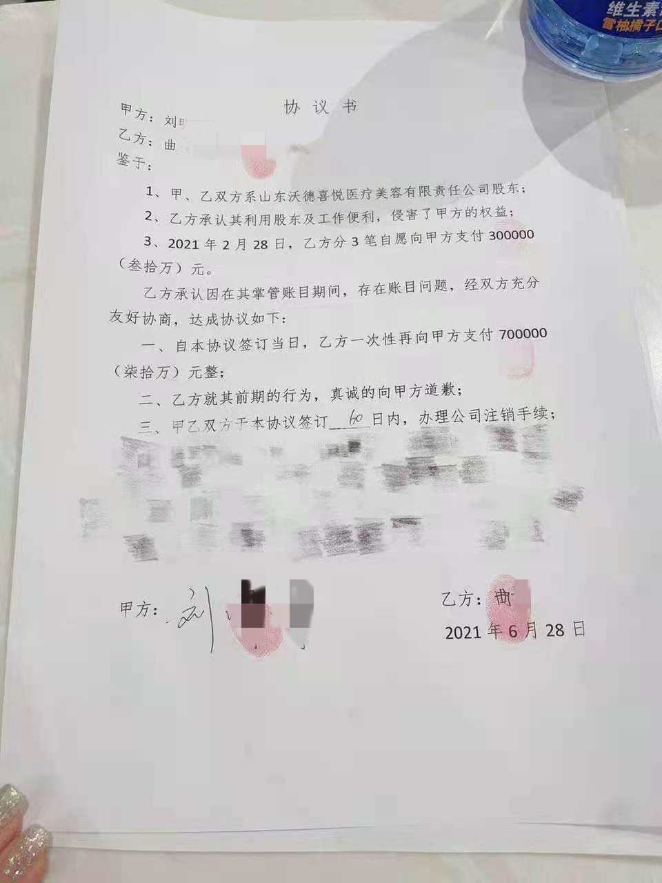 知情人士提供的一份由刘某明与曲某签订于2021年6月28日的协议书显示,两人作为山东沃德喜悦医疗美容有限责任公司的股东,曲某承认其利用股东及工作便利,侵害了刘某明的权益。