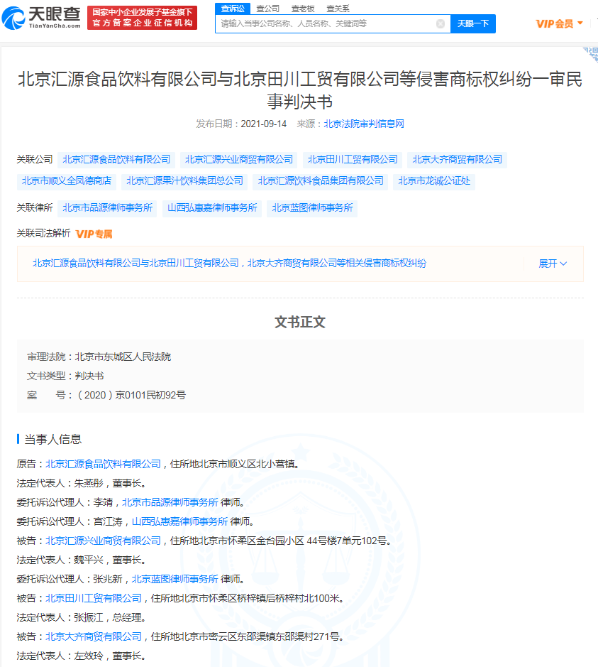 据天眼查APP显示,9月14日,北京汇源食品饮料有限公司与北京田川工贸有限公司等侵害商标权纠纷一审民事判决书公开,案号(2020)京0101民初92号,审理法院为北京市东城区人民法院。
