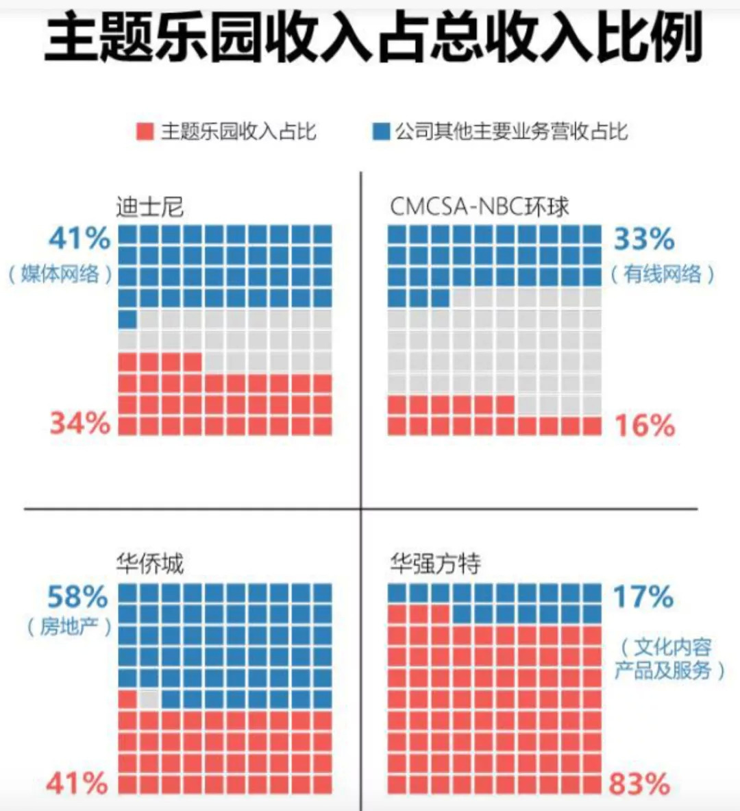 还值得注意的是,作为国内主题公园建设先行者的华侨城,其主题公园总收入中,房地产收入占到了近6成。与之类似,近年来万达、融创等开发商所做的主题公园,房地产收入应该同样占比不低。