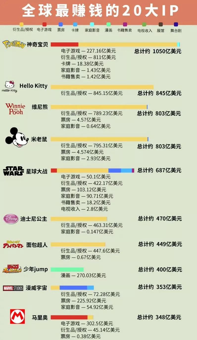 比如,在全球最赚钱的前20个IP排行中,华特迪士尼拥有7个IP,包括维尼熊、米老鼠、星球大战、迪士尼公主等老少皆知的动画形象;环球影业则拥有漫威宇宙中绿巨人的版权。