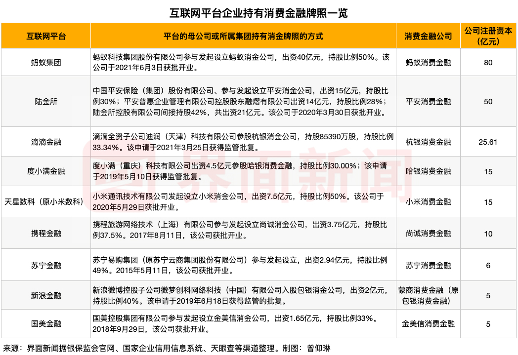 近年来,在金融业务必须持牌的监管要求下,上述多家平台的母公司或所属集团通过发起设立、参股消费金融公司等方式,将该牌照收入囊中。