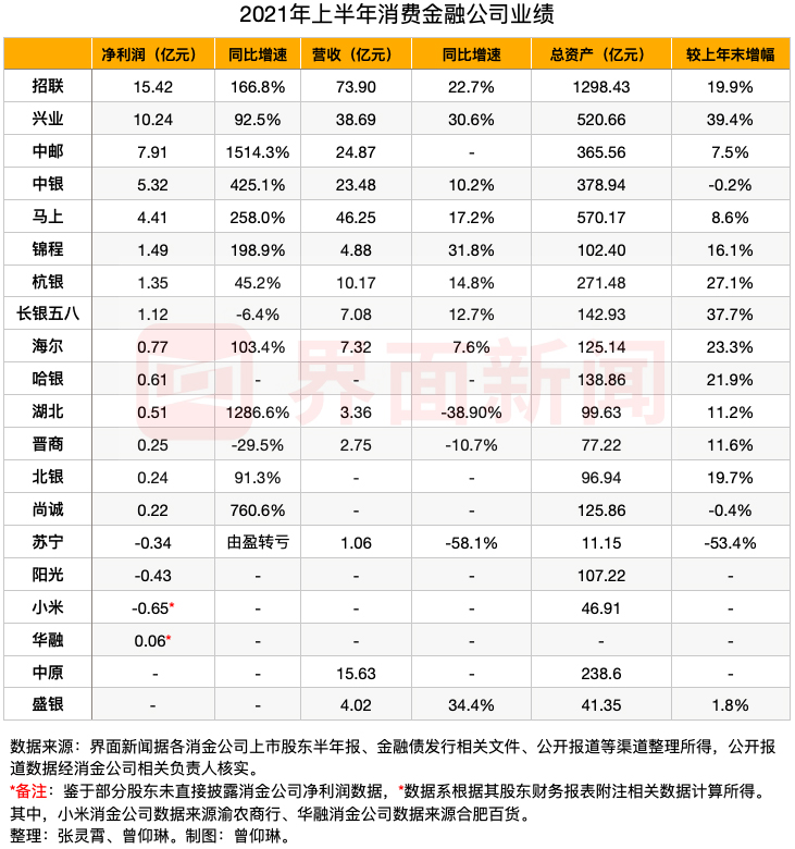 在净利润可查的18家消费金融公司中,仅小米消费金融、阳光消费金融、苏宁消费金融2021年上半年呈现亏损,净亏损分别为0.65亿元、0.43亿元和0.34亿元。