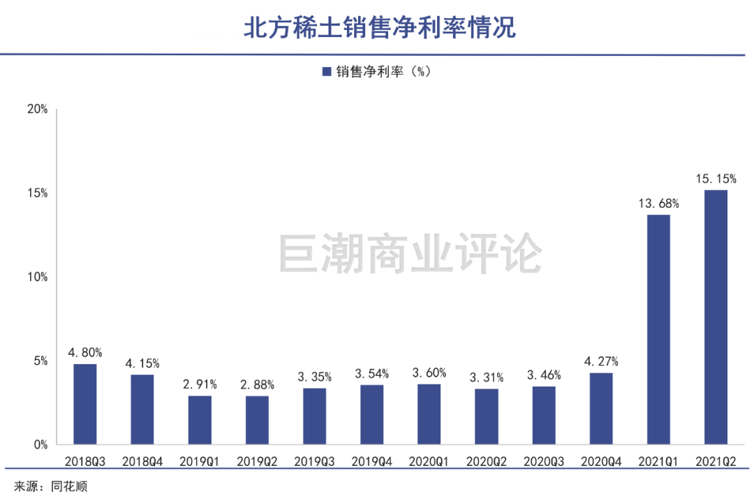 成本端的优势体现在了公司盈利能力上。上半年,北方稀土毛利率达到24.33%,同比增加13.8个百分点,净利率15.15%,上年同期仅有3.31%;两个指标均引领稀土资源类企业。