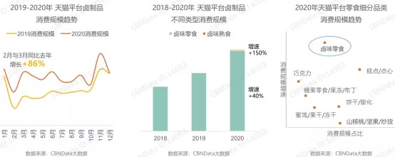 据CBNData大数据统计,2020年天猫平台上卤制品消费规模较2019年提升迅猛,平均增幅可达40%。
