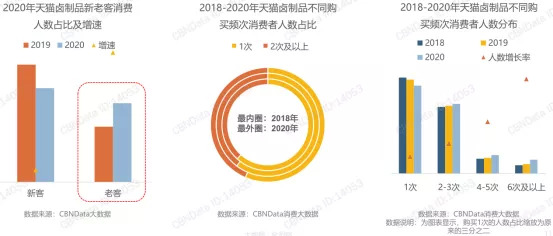 天猫平台卤制品销量2020年较2019年大幅提升,平均增幅达40%,且大量客户年购买次数在6次以上,复购率惊人。