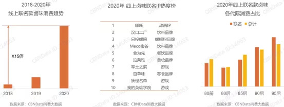 以哪吒、汉口二厂、只投螺碗为首的IP掀起的跨界联名风潮席卷到卤味市场,跨界联名的新潮玩法大大增加了卤制品的消費,从2018年到2020年,卤味联名款的消费量增长了15倍。